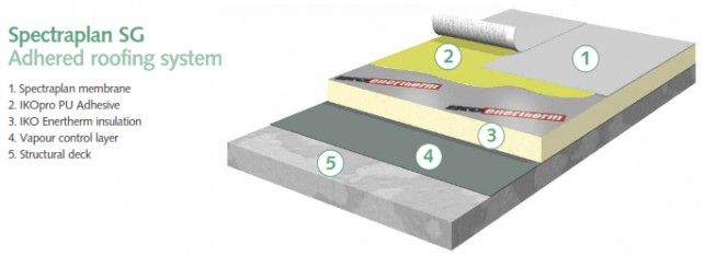 Untuk aplikasi yang membutuhkan metode adhered, tersedia IKO Spectraplan SG, yaitu membran TPE yang diperkuat glass tissue dengan backing fleece polyester. Produk ini dapat ditempelkan pada berbagai jenis substrat umum menggunakan PU adhesive atau IKOpro Sprayfast FMA adhesive, dan sama seperti varian SM, sangat cocok untuk proyek baru maupun renovasi.